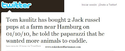 Tom Kaulitz comprou dois filhotes Jack Russel em uma fazenda perto de Hamburgo, em 01/10/10, ele disse ao paparazzi que queria mais animais para cuidar e dar todo o carinho.